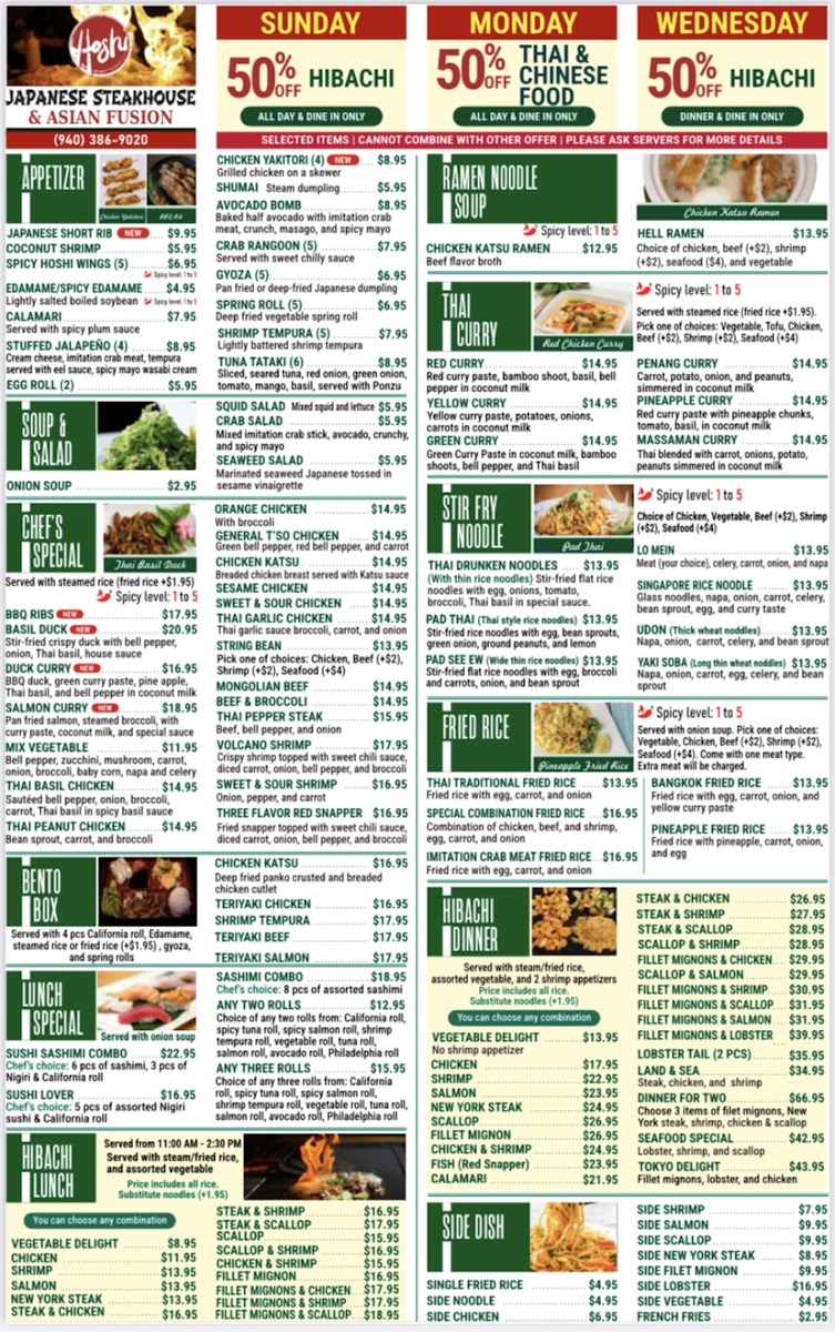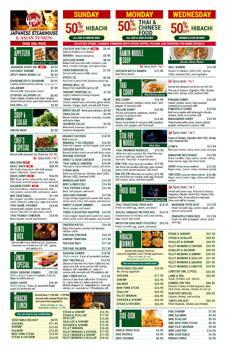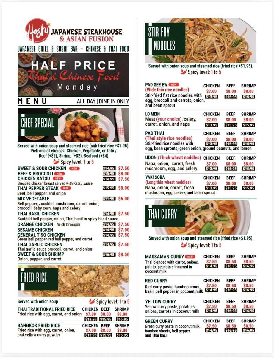 Choice of chicken, beef (+$2), shrimp (+$2), seafood ($4), and vegetable. Spicy level: 1 to 5