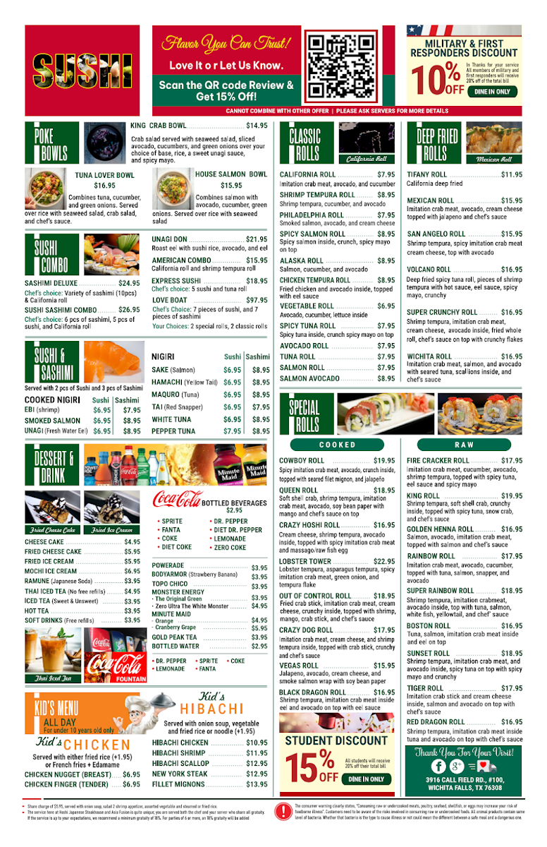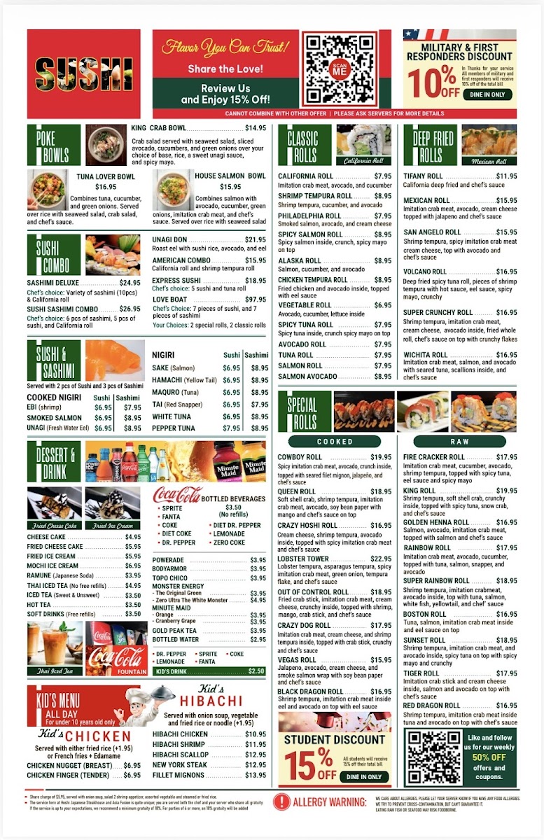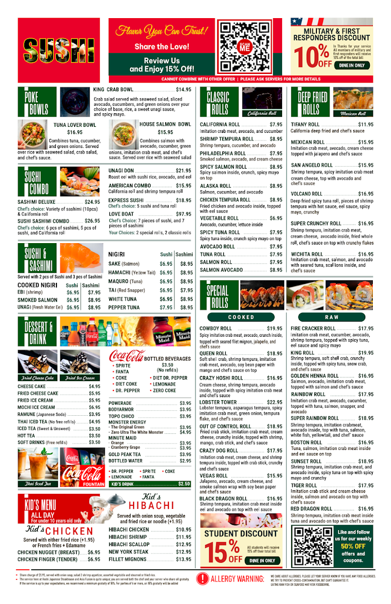 Shrimp tempura, imitation crabmeat, avocado inside, top with tuna, salmon, white fish, yellowtail, and chef' sauce